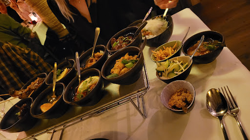 En dan het eten.... das prima voor elkaar. Wij namen het verassingsmenu, met heerlijke proeverijen en dessert. Mild gekruid, scherpere kruiden en een mix van saté. Vis, vlees, groentjes en rijst. De vele kleine porties zijn genoeg om te vullen, maar het plezier zat hem toch echt in de smaak van de verschillende kruiden en specerijen... feestje voor de smaakpapillen. Hoewel vrij prijzig, waren we...