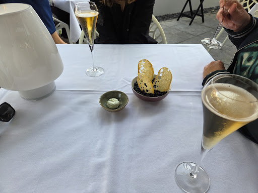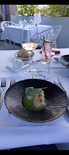We waren 10 minuten voor tijd in het genoemde restaurant en zorgden ervoor dat we op de juiste plek waren toen een jonge vrouw van het personeel ons onmiddellijk aansprak en ons op de meest beleefde manier begroette. Na het "inchecken" werd ons gevraagd of we een aperitiefje wilden op het terras. Natuurlijk was er een cava en een klein visje als voorgerecht. Verrukkelijk.