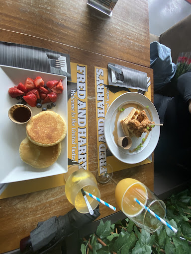 Read moreI came here before mini golfing and hadn’t had breakfast yet. Was told by a friend that it was really good but might be pricey. BUT TO MY SUPRISE the food wasn’t that pricey and well within the expected Budget for what you get, might even be on the cheaper side. The food was amazing. The chicken OMG, I had both the vegetarian and normal chicken strips and was beyond shocked how good they were (even ordered extra strips). The vega chicken wasn’t separable in flavor from the normal strips. The pancakes I had were fluffy and not too sneden and really lovely, especially with the fresh fruits. The homemade ice tea taste like the American sweet tea and the service was all around great. The owner was really sweet and helpful with all my requests and questions and was really informative about how Fred’s and harry came to be. OVERALL 11/10 and will definelty eat there...