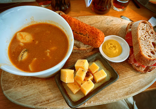 Dit restaurant hoort uiteraard bij het Watersnoodmuseum. Het is er knus, met een mooi uitzicht en modern design met opvallende accenten wat gebruik maakt van het invallende licht. Er is ook ruimte waar presentaties gegeven kunnen worden of waar tentoonstellingen te zien zijn. We hebben genoten van een typische lunch, tweemaal 12 uurtje met soep en twee maal een tosti voor de jongeren onder ons. Ik heb gevraagd voor de vissoep, dat werd wel een meerprijs, maar dat was het dubbel en dwars waard. Kaas van kaasboerderij De Stolpe uit de buurt met oa. honing, een kleine sandwich met Italiaanse ācold cutsā en een goede dressing en uiteraard een kroket met brood. De vissoep was ontzettend goed en ik heb zelden zoān goed gevulde vissoep gehad. Ik zou hier voor omrijden. Het personeel was erg behulpzaam, vriendelijk, kundig en toen er wat tijd was, ook een praatje maken met de mensen in het restaurant. Ik kom hier heel graag...