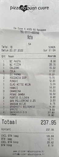 Read moreZo tijd voor een review en die is niet best... We hebben vanavond 2 pizzas besteld en opgehaald. Eenmaal terug op de camping, wat letterlijk 5 minuten fietsen is, waren de pizza's koud, niet lauw maar koud! Ik heb hier over gebeld en de situatie uitgelegd aan een relatief vriendelijk jongeheer. Eenmaal weer te zijn terug gefietst werd mij gevraagd waar de pizza's waren die koud waren. Ik heb letterlijk gezegd moet ik nou heen en weer fietsen om vervolgens door jullie te laten controleren of de pizza's werkelijk koud zijn? Uiteraard zijn ze nu inmiddels koud... De jongeman met wie ik gesproken had aan de telefoon zei ik ga maar van het beste uit want het kan ook zo zijn dat er 2 mensen nu pizzas lopen te eten bij u en dat ik 2 gratis pizzas mee geef. Nou werkelijk bedankt dat er zo over klanten wordt gedacht. Enfin mijn grootste probleem was niet eens de koude pizzas, waar gewerkt wordt worden fouten gemaakt en als het netjes wordt opgelost dan zal je mij niet horen. Nee het was de houding van de dame achter de bar, bah!! Wat een onvriendelijke, niet proffesionele, horeca .... ! Toen ik in eerste instantie de bestelling kwam ophalen en even wachtte aan de bar met een biertje (alla 3.90€) werd er vriendelijk met me gepraat en was alles koek en ei. Maar toen ik een tweede keer terug kwam na een klacht werd ik als oud vuil behandeld! Geen lachje, geen vriendelijke serveersters meer, met uitzondering van een blonde dame die was net zo vriendelijk als daar voor, mocht dit gelezen worden dan naar haar alleen mijn complimenten. Toen ik vroeg of ik 20€ kon wisselen om toch nog een tientje fooi te geven voor de 2 pizzas die in eerste instantie goed hadden moeten zijn werd er gezegd door de dame in kwestie sorry we hebben geen wisselgeld. Wat een ongelooflijke ... smoes, het terras zat letterlijk vol. Als dat echt waar is dan is het helemaal een waardeloze toko. Toen ik weg liep sprak ik de jongen van de telefoon aan en zei dat ik graag nog een tientje wou geven voor de service maar dat er geen wisselgeld was. Hij vertelde dat ik ook kon pinnen. Dus ik heb nog een tientje extra aan fooi gegeven voor klaarblijkelijk het gigantische probleem wat ik veroorzaakt had door een simpele klacht in te dienen. We zitten op de camping hier in Renesse, iedereen op dit veld en hiernaast weten hoe ik ben behandeld. Door deze ervaring hoop ik dat het hun een stuk meer gaat kosten dan 2 simpele (warme pizzas). Nogmaals iedereen maakt fouten maar om je klanten als minderwaardig te behandelen omdat ze een klacht hebben is een no go! Btw de pizza's waren de 2e keer prima, ik had alleen geen honger meer na deze ...