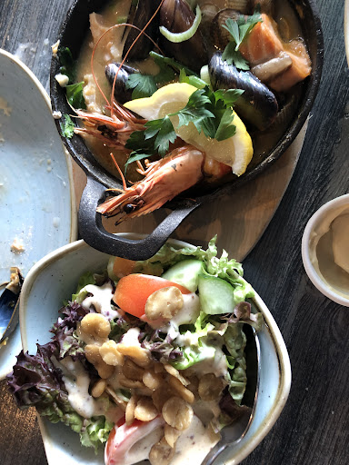 Veel goede verhalen over jullie gehoord en dus besloten om bij jullie een hapje te eten. Maar wat was dit een enorme teleurstelling zeg. Het oorspronkelijke terras zat vol, maar aan de overkant was nog een extra terras waar we ook plaats konden nemen. Met de boodschap dat bij het andere terrasgedeelte dezelfde kaart wordt gehanteerd. Prima! Dus namen we plaats aan de overkant. Eenmaal daar aangekomen ziet de kaart er heel anders uit en staat er veel minder op. Geen mosselen die we toch wel graag wilden eten. Nog aan een medewerker gevraagd of we echt alleen dingen van deze kaart konden kiezen. Na overleg kwam ze terug met het antwoord dat we alleen gerechten konden kiezen van de kleine kaart. Dus wij wat anders uitgezocht. Het voorgerecht wordt geserveerd op een papieren bordje en in papieren bakjes. Het hoofdgerecht werd geserveerd in papieren bakjes en de patat werd in een papieren zak geserveerd. Erg teleurstellend dus. Even later terwijl wij al aan ons hoofdgerecht zaten zien we om ons heen allemaal mosselpannen op tafel komen, terwijl zij er later zijn komen zitten dan ons. Dus wij vragen om verduidelijking. De meeste rare antwoorden kregen we. Ja die mensen zaten er al eerder, terwijl wij toch echt het eerste tafeltje waren. Ik weet hier niks van. Ik werk niet in de keuken. Vervolgens vroegen wij of er iemand anders gehaald kon worden, die ons het zou kunnen uitleggen, prima wordt gehaald wordt ons verteld. Kwartier later nog niemand. Dus nogmaals vragen. Wordt er vrij onbeschoft tegen ons gezegd, dan loop je maar naar de overkant maar voor je je verplaats betaal je bij mij. Eenmaal bij de overkant aangekomen, krijgen wij alleen maar te horen communicatiefout dit dat. Een excuses kon dr niet van af, erg onbeschoft. Dus als je uit papierenbakken en zakken wilt eten terwijl je verwacht dat je lekker uiteten gaat en verneukt wil worden waar je bij staat moet je zeker hier uiteten gaan! Daarnaast was de bediening ook erg traag en hebben wij bijna 45 minuten moeten wachten op...