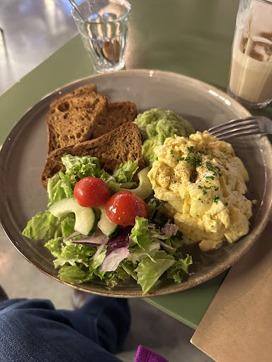 Cafe Mundo (The Library) in Sittard is a gem! I had the scrambled eggs with gluten-free (glutenvrij) bread, avocado, and a mixed salad topped with a delicious vinaigrette that was absolutely divine. My vanilla café macchiato was the perfect accompaniment.