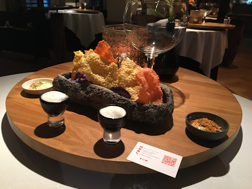 Na een veel te lange tijd weer naar onze favoriet in Zeeuws Vlaanderen. De reis duurt altijd langer dan verwacht, precies op tijd kwamen we aan. We werden begeleid naar een grote ronde tafel in het restaurant. Als aperitief een Albariño van Val Do Sosego die goed beviel. Gepresenteerd in een schaal met zwerfafval uit de Noordzee de bekende shot van gin tonic met limoen, heel fris. Krokantje met vadouvan, krokantje met Thaise curry die duidelijk wat pikanter was en twee lekkere dipsausjes. Chef Edwin Vinke kwam persoonlijk onze wensen opnemen, keurig.