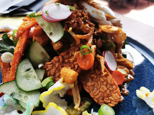 De sfeer is goed. Ik vind het echter wel storend als er geen kraanwater wordt geserveerd (naast 5 maal een hoofdgerecht en 4 drankjes vind ik het aanstellerig en onnodig milieubelastend om alleen fleswater te serveren). Dat heeft misschien al geen goed begin geschapen, maar het eten vond ik ook maar matig. Mijn naanbrood met falafel was zo overgoten met kaas dat het een nogal vette hap werd, zonder frisse of pittige tegenhanger hanger. Mijn vrouw was ook niet erg gecharmeerd van haar keuze (de veganburger). De frietjes bij de gerechten waren ook van...