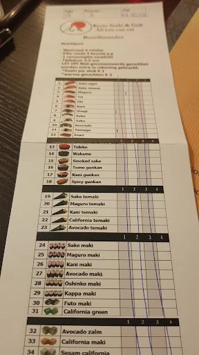 Op dinsdag 21 januari 2020 zijn mijn vrouw en ik voor het eerst bij Kyoto gaan eten. Onze eerste indruk was dat het er gezellig uit zag qua inrichting. We werden netjes geholpen en gevraagd of we al eerder met hun tablet hebben gewerkt. Wij vertelden dat het voor ons bij Kyoto de eerste keer was. Het werd netjes uitgelegd. De bestellingen kwamen vlot. Het eten was redelijk. We kunnen het goed vergelijken omdat we verschillende sushi restaurant zijn wezen eten door heel Nederland. Qua eten zijn er wel wat aandacht punten. De basis shusi nummer 1 bij elke sushi restaurant is de Sake. De rijst was niet goed het kleefde niet goed en er zaten harden rijstkorrels in. Tevens viel de rijst uit elkaar. Het zeewier was erg hard in de sushi. De gebakken banaan was tegen het witte aan. Mag langer in de frituur. De keuze op de kaart mag ook wat meer. (Zie andere sushi restaurants) PS dit zijn tips wat ermee gedaan wordt is uiteraard aan de leiding. Vanwege dat er met tablet wordt gewerkt heb je weinig tot geen contact met de bediening dat is jammer. Je moet vragen om bepaalde producten wat je standaard al bij andere sushi restaurants krijgt bijvoorbeeld gember. Het enge wanneer je even contact heb is bij het afrekenen dan vragen ze of het gesmaakt heeft. Misschien zijn wij erg verwend. Shusi restaurant Hana te Leeuwarden is op dit moment de beste met 5 sterren. (Tip voor de leiding van Kyoto ga daar is eten proef...