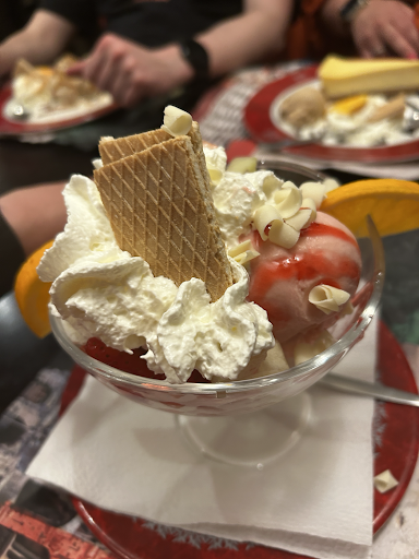 Het dessert smaakte prima, maar er zat alleen aardbei op en geen tropisch fruit zoals beloofd. Tijdens het dessert hoorden we medewerkers luid roddelden over gasten, die ze "zeikers" noemden. Onprofessioneel en onbeschoft.