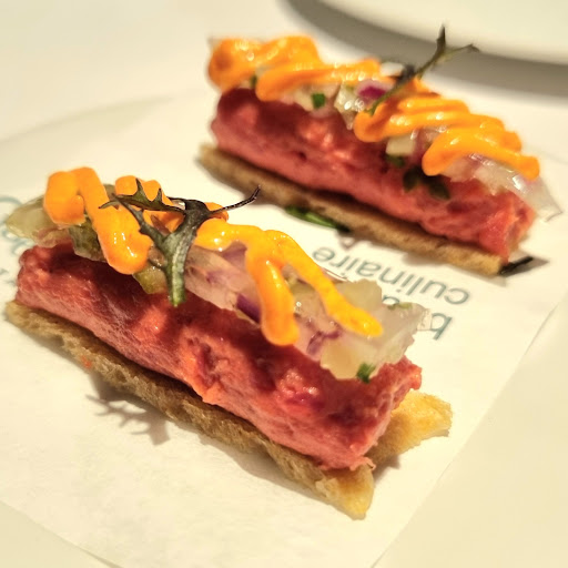 De eerste begeleider werd beknopt toegelicht, uit Hongarije de inheemse Juhfark 2016 van Tornai waarin tonen van rijp fruit met mineraliteit. Op een wit bord een fleurige presentatie, sashimi van hamachi met kleine tomaatjes, dunne plakjes, rettich, mini radijsjes, paaltjes van koolrabi, krokantje met stukjes avocado en groene blaadjes afgeweekt met een licht pikante zoetzure dressing. De de delicate smaakjes van de hamachi vielen weg naast die van de groentjes, waardoor het voor mij een verfijnde salade werd. De wijn was in balans. (7)