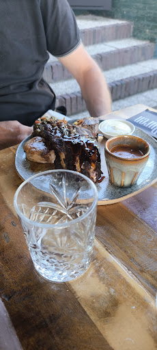 Het eten was lekker We hadden een Peking eend en garnalencocktail vooraf en beide waren gewoon goed. Als hoofdgerecht had ik de catch of the day en dat was in sesamzaad gepaneerde tonijn met twee groene asperges en drie wortels prima beetgaar. Summiere hoeveelheid saus erbij : 5 fraaie druppels op het bord ( mooi maar bijna niks) dus een ( ieniemienie) bakje chimichurri ( heel lekker met heel veel knoflook) á €1.50* er bij besteld (* voor net aan 1 eetlepel) Mijn tafelgenoot had de mixed grill met ailoli en Stroganoffsaus bijbesteld ( €1.75 voor een esspressobekertje) veel vlees en alles goed op smaak, helaas de biefstuk well done gebakken en dus te gaar ( er wordt vooraf niet gevraagd hoe je hem bereidt wil hebben) De friet echt lekker gebakken zoals je hoopt dat een frietje is en de parelcouscous ook lekker. De bediening is jong en welwillend. Doen zeker hun best. Het was druk en daardoor waren ze niet heel goed te bereiken maar, echt vriendelijk en leuk als dat wel lukte.