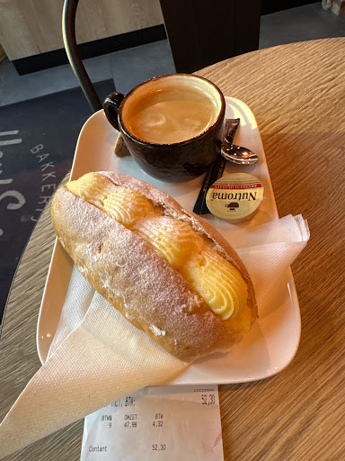 Ambachtelijke bakkerij, mag je toch wat van verwachten. Terras tegenover de winkel, mooi plekje. Cappuccino met een hazelnootcrèmegebakje besteld..... tsja dat de cappuccino iets minder is dan een " echte " cappuccino is tot daar aan toe maar dat homemade gebak van een ambachtelijke bakker gewoon nergens naar smaakt is toch een behoorlijke domper. Hazelnootcrème, 80% van het gehele gebakje, zonder enige smaak, net of je een pakje bruine margarine naar binnen werkt. Heel jammer en totaal niet verwacht, misschien is 2 sterren...