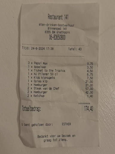 Read moreWat een fijn restaurant! We verbleven een lang weekeinde in Giethoorn en zochten een leuke plek voor een verjaardagsetentje. We zijn met een familie van vegetarische, veganistische en vlees-eters. En we werden allemaal blij van Restaurant 141. De bediening is heel sympathiek en meedenkend. Bij het broodje vooraf kregen we spontaan hele lekkere veganistische kruidenboter. Als hoofdgerechten hadden we de dry aged beetroot maaltijdsalade, vegetarische shoarma, spareribs, zalm-maaltijdsalade en tempeh van bonen in teryakisaus. Allemaal met lokale seizoensproducten bereid en allemaal heerlijk. Qua veganistische hoofdgerechten dus keus uit 3 en dat is behoorlijk bijzonder in een niet-veganistisch restaurant. Mijn dochter vond in elk geval dat ze nog nooit zulke goede service had gekregen in een "gewoon" restaurant. We dronken hierbij de huisrosé die echt goed was.