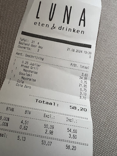 Enkele dagen na de opening hebben we vandaag een bezoek gebracht aan LUNA āeten & drinkenā, in het nieuwe winkelcentrum van Stein. Het terras, dat vrij groot is, was rond lunchtijd goed gevuld. Duidelijk was dat het ca. 6 personen sterke team van de bediening de draai nog niet helemaal had weten te vinden. Zichtbaar ietwat onwennig bewoog men zich langs de tafels, zonder dat duidelijk was wie, voor welke tafels verantwoordelijk was. Het duurde best wel even voordat bij ons, overigens heel vriendelijk, de bestelling van de dranken werd opgenomen. Het uitserveren van een paar cappuccinoās duurde vervolgens minstens een kwartier. Gelijk bij het serveren van de koffie hebben we onze lunches besteld. Het uitserveren daarvan nam ongeveer 45 minuten in beslag. In de tussentijd hebben we nog eens bezoek gehad van een serveerster die bij ons enkele ā overigens niet door ons bestelde - drankjes wilde brengen. De meneer die uiteindelijk de Clubsandwich kip en bacon en de Panini Club bracht, verontschuldigde zich weliswaar netjes en attent voor het lange moeten wachten, maar dat neemt niet weg dat dit verbetering behoeft. We willen dit prille initiatief best een kans gunnen, maar een analyse en evaluatie van de dagafloop om te komen tot verbetersuggesties lijkt ons hier wel op zijn plaats. Voor wat de waardering betreft, wil ik het vooralsnog op...