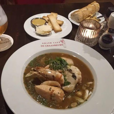 Read moreSamen met mijn ouders en echtgenote gedineerd bij de Graanbeurs. De menukaart kenmerkt zich door gewoon mooie gerechten. Ook voor de vega's (wij zeker niet) ooit wel eens vega coq au vin gegeten? Bij de Graanbeurs staat het gewoon op de kaart. Boven de bar prijkt een verlicht bord van Duvel met de tekst "Duvel loves de Graanbeurs". Eerlijk is eerlijk... Wij ook! We hadden alle vier verschillende gerechten. De voorgerechten (uiensoep, carpaccio en foie gras) Alle voorgerechten waren oldfashion, maar ook zo goed. De hoofdgerechten (confit de canard, goed gegaarde eendenpoot met een goedgekleurde stoofpeer) vispannetje, met een diveriteit aan soorten vis in een romige saus, scampies in pernodsaus en een tournedos met roqueforsaus, mooi stuk vlees, goed gebakken en mals) waren goed. Het lijkt eenvoudig, maar de Graanbeurs krijg je verse friet met home-made mayonaise! Dit alles werd uitgeserveerd door Arie. Een jonge gast met gevoel voor humor. Martijn en Karlijn mogen blij zijn met deze kanjer! Ik wilde graag nog wat foto's bij deze review plaatsen, maar helaas... Ik was te laat. Er zit niets anders op dan dat we nog een keer terug...