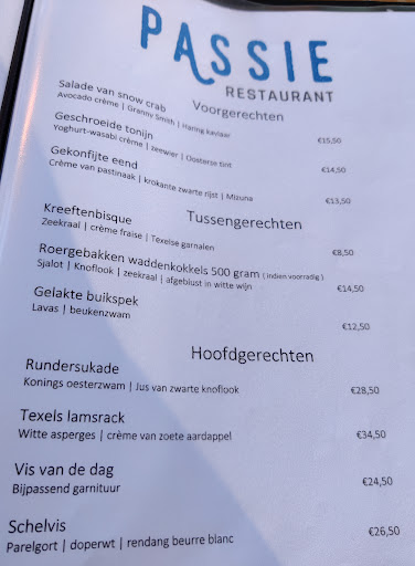 Toen we in september 2020 op Texel waren, bestond de PASSIE nog niet eens op deze locatie in De Koog. Nieuw op locatie De Koog is de "PASSIE". Wij gaan al lange tijd meerdere keren per jaar op vakantie op Texel in De Koog. Eind september 2020 was het restaurant, net als het jaar ervoor, volledig gesloten!!! De mooie oudere recensies van een jaar of twee geleden horen dus zeker niet bij het restaurant aan de Dorpsstraat 170, 1796 CG De Koog.