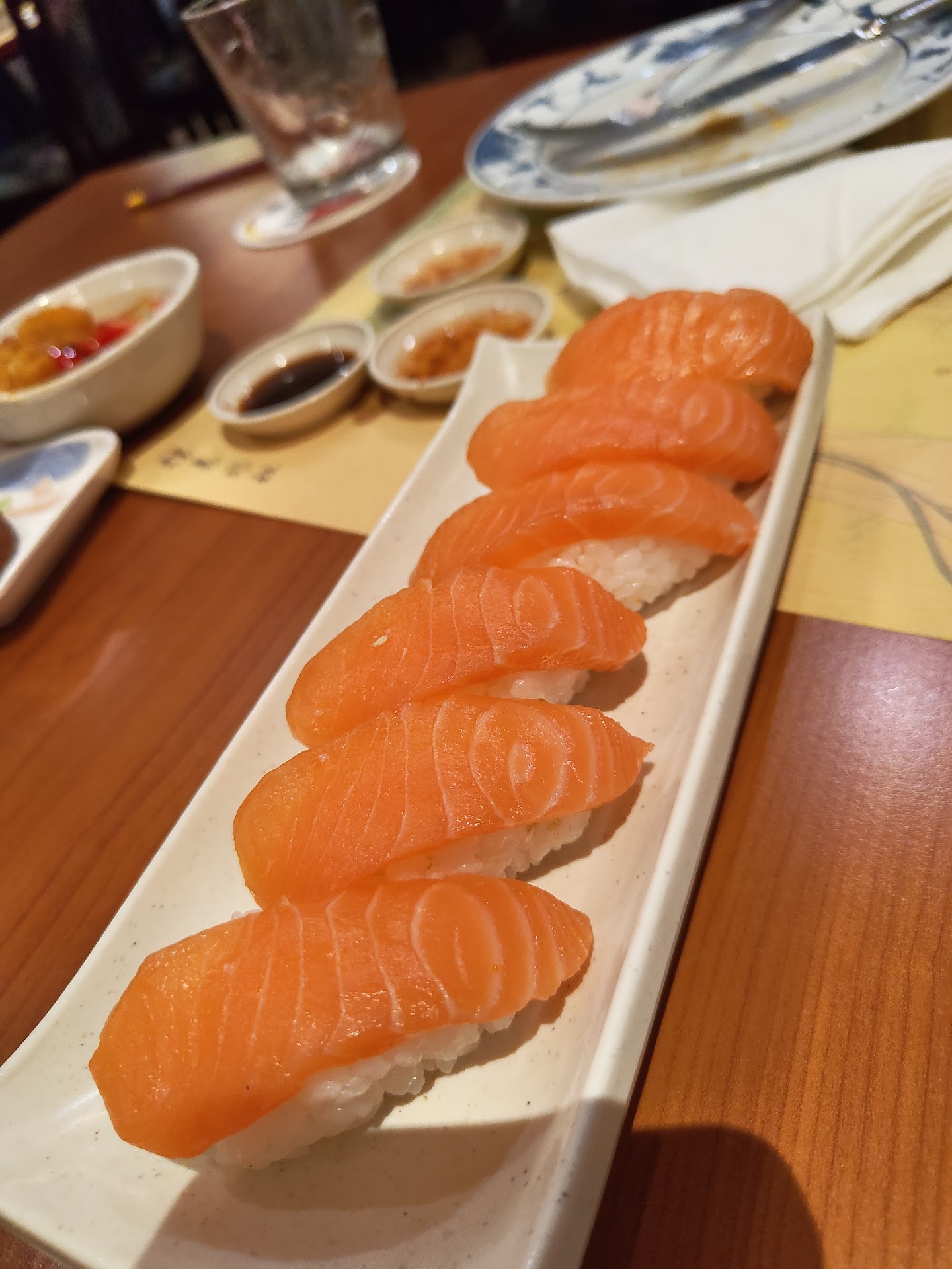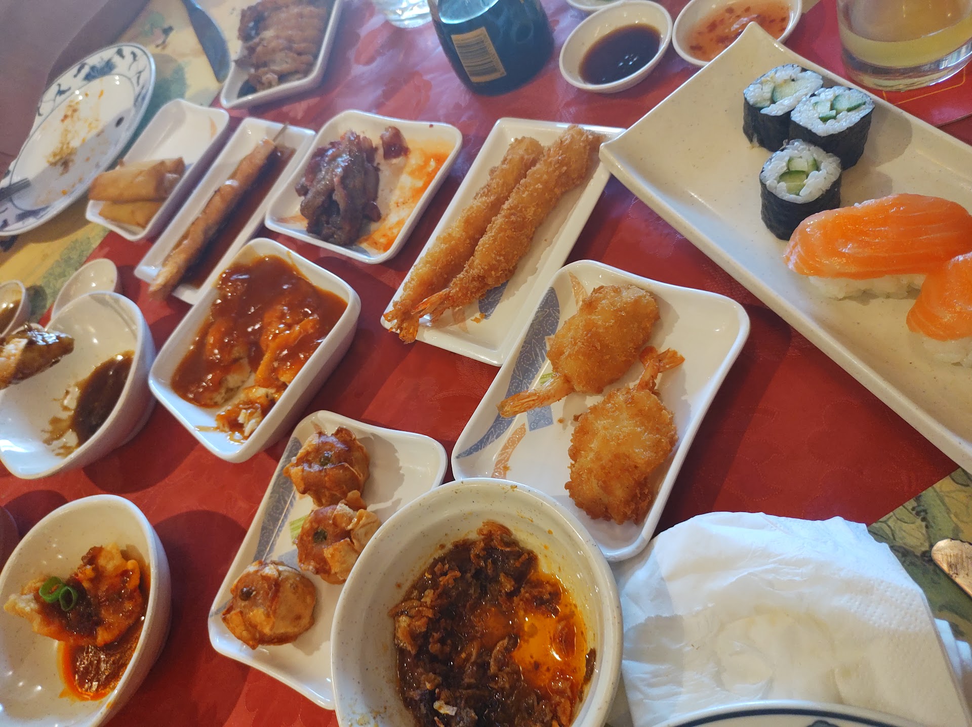 Eenmaal aan het eten vroegen we hem om eetstokjes terwijl de tafel al vol met sushi stond. Even keek hij verbaasd en zei toen aaah stokjes. Hoeveel? Hij liep weg maar er kwamen geen stokjes. 5 minuten later liep hij langs de tafel met zijn tas en riep tegen iedereen: fijne avond. En weg was hij. En wij geen stokjes.