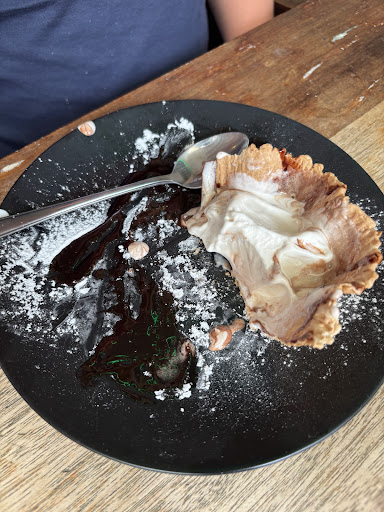 Kijk, als je na ruim twee jaar door omstandigheden niet naar Texel kon en je wordt begroet met de woorden: "wat leuk dat jullie er weer zijn", dan is dat op zich al (meer dan) vijf sterren waard. (Heerlijke no nonsens bediening en fijne muziek op de achtergrond). Wederom weer enorm genoten van overheerlijke pannenkoeken. (De pannenkoeken hier zijn niet van die dikke deegplakken, maar heerlijk krokant aan de rand). En dankzij een vernieuwde kaart, kun je uit veel smaakcombinaties kiezen. Ik had gekozen voor de Indiase pannenkoek. De bijbehorende, lekker pittige, curry had ik uit het schaaltje in één keer op mijn pannenkoek uitgestort en verdeeld. Daarna de pannenkoek opgerold (als een soort roti rol) en steeds een stukje als een soort kleine rol afgesneden en daarna in één keer in mijn mond geschoven. Op die manier iedere keer weer een heerlijke smaakexplosie. Mijn partner had de Franse pannenkoek met brie, rode ui en prei. Volgens haar ook een verrukkelijke combinatie. Dat de pannenkoeken niet zo dik zijn, heeft ook als voordeel, dat je daarna nog ruimte hebt voor een lekker nagerecht. Mijn partner koos voor Luxe Sundae Karamel (ijs met karamel, geserveerd in een bakje van wafel). Ik koos voor een klein portie poffertjes 'begeleid' door een heerlijke Palmbeach Milkshake. Wat een lekkere combi was dat en wat een geweldige afsluiter van dit lekkere etentje. Hier komen wij zeker weer terug. Want er staan nog een paar gerechten op de hernieuwde kaart, die we absoluut willen uitproberen..... Als je hier gaat eten, besef dan wel dat je plaatsneemt in een pannenkoekenrestaurant die sfeer en uitstraling heeft het dan ook. En daar is verder niets mis mee. Vandaar dat ik ook voor de sfeer 5...