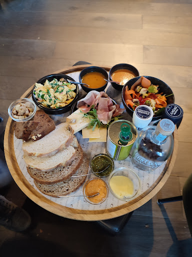 We moesten lang wachten op onze bestelling: brood met dipsauzen. Na zeker 20/25 minuten gewacht te hebben, gevraagd naar onze bestelling. We kregen alleen te horen dat de keuken het druk had en vroeg of we het wilde cancelen (?!). Toen wij zelf met het idee kwamen of ze het even wilde navragen in de keuken (status) gaf ze aan dat ze dat zou doen. Toen ze terugkwam zei ze dat het bijna klaar was. Nog even gewacht en ons brood met smeersels was er. Zag er goed en kleurrijk uit maat dit was echt de slechtste brood met smeersels die we hadden gegeten. Dit kwam doordat het desembrood (wat gewoon leek op simpel, geen vers brood) uit elkaar viel en koud was. Focaccia was lichtelijk verwarmd maar ook brokkelig en aan de droge kant. Dipjes van pesto, humus en paprika waren niet smaakvol en geen fijne combinatie met het brood.