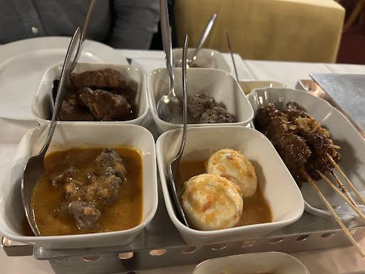 We did a reservation the day of and glad we did because past 7:15 pm it was all booked. There are so many choice on the menu but we went with the Rijsttafel "Poentjak". This was our first time order this experience and it was really nice. One by one all the food came out and sat in a hot metal box that was heated with candle. The food was: Nasi Putih & Nasi Goreng (Rice), Krupuk (Prawn Crackers), Serundeng (Coconut with Peanut), Ikan Teri (Dried Fish), Atjar (Pickles), Gado Gado (Vegetables in Peanut Sauce), Rudjak Manis (Mix Fruits), Babi Ritja (Pork Meat), Daging Besengek (Beef), Sambal Goreng Ari Ajam (Chicken Liver), Sate (Satay in Peanut Sauce), Ajam (Chicken), Sambal Goreng Telor (Eggs), Tumis Sajuran (Mix Wok Vegetables), Sajur Lodeh (Vegetables in Coconut Sauce), Sambal Goreng Rebung (Bamboo Shoot), Sambal (Chili). The service was really good, the employees check on us a lot to see if everything was ok which was really nice. My favorite was the Daging Besengek (Beef) and the Sambal Goreng Telor (Eggs)....