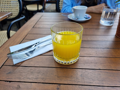 The place is nice. However I was really surprised that they sell a regular sized 'fresh orange juice' for 6 euros, but it's obviously mixed with 50% water. When I went inside to ask they if they actually have orange juice without water mixed, they told me they get it from a supplier and that they don't think it's mixed with water but that the pulp is filtered out. But that's is not the problem, pulp filtered out doesn't make the fresh orange juice taste like water. I can assure you that it is mixed with water. They shouldn't sell it for that prices as fresh orange juice and then tell you it's 100% orange juice. They were decent enough to remove it from the bill for me. Their food is decent, depending on what you choose. The poached eggs with salmon is very small compared to other similar places for this same dish. The Hollandaise sauce was medium in taste as well. The facts that msot reviews here mention the food is great doesn't mean it always is. I review this honestly as it is in my opinion. Their chicken sandwich however was a really fair portion though. All in all bit disappointed in the quality. It's not bad but definitely not worth 5 stars. Specially not when the owner is trying to tell me I'm wrong for having some point on what...