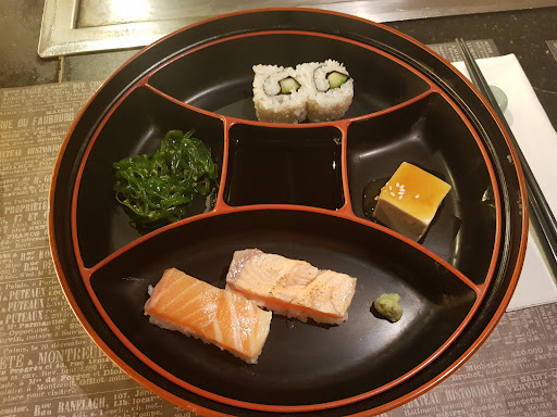 We hadden menu D(vis) en E(vlees) genomen. Vooraf de gebruikelijke schaal met sushi met in het midden een minimale hoeveelheid kikoman. Wasabi werd er niet bij geleverd. Daarna een soepje wat meer naar verwarmd water smaakte dan naar de wortel, tahoe en lente-ui . Vervolgens de champion op een wortel met courgette. De champion was totaal niet gaar en volgens mij mocht de kok de plaat ook wel wat hoger zetten, de wortel en courgette waren ook nog keihard.