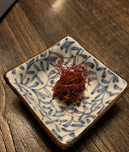 Right of the bat, disappointment set in with our waitress. She radiated no hospitality. She summed up the choices to be made with the menu...in English...and with the speed of light! No empathy for our short attention span as we were in still in the high-spirits of our re-encouter with friends. Also no respect that we needed to translate these menu instructions to them. Only 2 of us noticed that in the Omakase menu (putting courses completely in the hands of the chef) would not contain any sushi. Somewhere in her quick account she had said that a choice for Omakase would mean Omakase for everyone in our group. Although our objective was not to miss out on great sushi, some of us (being the ones who had missed the 'no sushi' detail) were interested in Omakase. Choice was made for the Omakase 5 courses, 68⬠(!) per person.