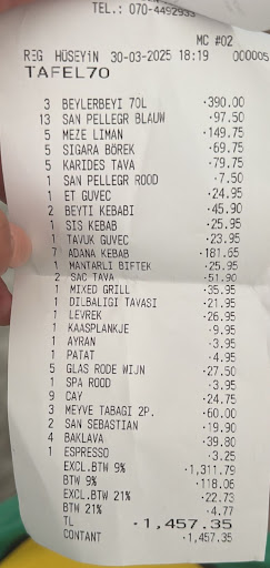Read moreWe went there for our friend’s birthday. We paid what was asked because it was a courtesy for our friend. However given the fact that the restaurant is not even in Amsterdam to justify the price, i would recommend to buy a house in Den Haag and put the downpayment in the bank instead of having dinner here. It is how expensive and overpriced it is. Mezes were terrible and they gave 1 pepper dolma for 4 people which means that also service and hospitality were...