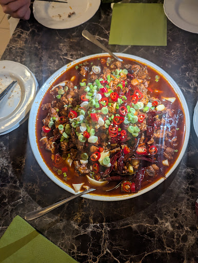 Read moreGreat Dapanji, which is totally worth it for a small group of 3-4 persons. Nice spicy chicken (with bones) over a bed of hand pulled noodles, potatoes and peppers. The stew is intensely flavorful and spicy (we asked for medium spicy which was already at a good heat level even for high threshold folks), but spicy in a nice way, it will warm you up on a cold day - Szechwan peppers and a nice kick alongside the other dried chillies - watch out for the tiny ones! There is a lack of vegetarian options, although they were able to make one of the noodle dishes veg. but it was comparatively not worth it (18 euros) compared to the Dapanji which comes to 15-17 euros per person for an immense portion and quality. You can get black tea, and some carbonated soft drinks or Ayran (probably a good idea...