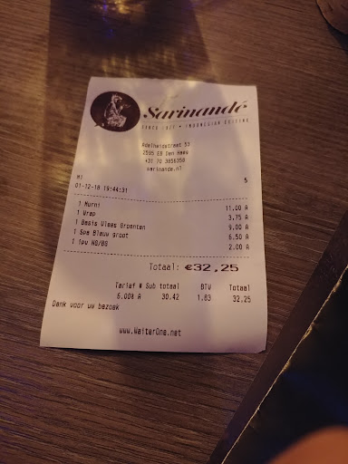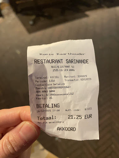 Read moreIk heb echt jarenlang in een zijstraat van de Theresiastraat gewoond, vlakbij dit restaurant dat blijkbaar al 40 jaar bestaat. Wij zijn dol op Indonesisch eten en zijn altijd op zoek naar nieuwe adresjes. Via een bekende kortingswebsite die wij vaak gebruiken om kennis te maken met verschillende restaurants en dienstverleners, bij Sarinandé. terechtgekomen. De bediening is heel vriendelijk. De bijgerechten zijn vrij prijzig. Met gemiddeld 2 drankjes pp, hebben wij alles bij elkaar toch nog ruim 40,- pp bovenop de vouchers betaald. Mandje krupuk a 5 euro met hele stevige pindasaus. De kroket kentang en vooral de martabak waren erg smakelijk. De saté-mix had goed gemarineerd vlees en was lekker gegrild, maar de saté babi was wel erg taai. De dorade was te ver gefrituurd (hard) maar de sojasaus erbij was lekker. Nog lekkerder zou het zijn als de saus warm was. De buikspek was veel te hard en gortdroog. Die hebben we goeddeels laten staan. De terong blado was erg lekker, net als de nasi goreng met een vleugje trassi. De spekkoek is naar onze bescheiden mening, niet huisgemaakt. De meeste gerechten zijn vol van smaak en authentiek, maar sommigen stelden uiteindelijk wel teleur door de matige bereiding. Eindcijfer:...