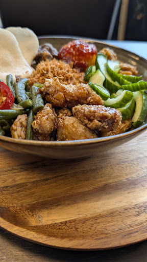 The concept is simple and great: you create your own mix bowl – for example, two types of meat, two vegetables, and a base like jasmine rice, fried rice, or noodles. Optional toppings include a chili-soaked boiled egg, tempeh or tofu, and a lovely garnish of toasted coconut flakes. There's also a tasty sambal available on request. At around €16 for a regular bowl, the price is more than fair considering the quality and portion size.