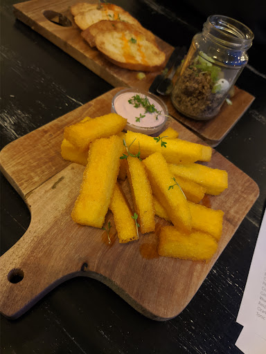 In my opinion, the food was sub par. Mushroom pate: The mushroom pate was not pate. It was small chunks of mushrooms that didn't form a smooth paste. It was just roughly chopped. Pate is supposed to be SUPER creamy and should spread on a piece of toast with ease. It didn't look anything like pate and was not intriguing taste wise in my opinion. The bread was came with it was rather dry. The pickles were nice. Polenta fries: The texture was nice and crunchy (as expected for a deep fry) but the taste was so lacking. Polenta fries can be delicious but this was blend. The mayo that came with it was also very blend.