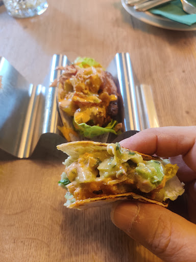 Read moreMooie zaak, industrieel en warm ingericht. Dus veel beton, zichtbare leidingen, grote lampen met hoofdkleuren groen en bruin. En veel planten. Grote wijnkaart, echter onder de €10,- per glas zijn slechts 5 witte en 4 rode verkrijgbaar, los van de dessertwijnen. Bij inschenken eerst de gelegenheid om te proeven, ondanks dat de fles al geopend is of geen kurk heeft, heel netjes. Cappuccino is ook helemaal prima. Heel enthousiaste mensen en heel prettige bediening Voor mij eigenlijk 3,5 ster. Waarom nu nog geen 5 sterren... Er zijn duidelijk nog verbeteringen mogelijk. Kleine dingen zoals glaswerk. Elke drank, of het nu cocktails zijn, wijn, koffiebereidingen hoort eigenlijk in het bijbehorende glas. Wijnglazen kloppen, echter Latte Macchiato hoort in een hoog glas om diverse redenen, en niet in brede "rocks/double old fashioned" glas. Qua lunch vond ik het wat tegenvallen. Prijsstelling ten opzichte van het gebodene vind ik wat uit balans. Dit door de combinatie portie grootte en kwaliteit. Taco's met buikspek voor €11,50. Hiervoor kreeg ik 2 kleine taco's. Het buikspekvlees was aan de droge kant. Het zuur is duidelijk aanwezig, maar de kiwisalsa weer niet. Mooi gerechtje, maar balans nog niet helemaal gevonden. De Thaise omelet, als je deze frituurt is deze echt Thais, ipv bakken in de koekenpan. Voor een normale omelet, vuur wat lager, sorry mee gekeken, anders bruineert deze en dan is het eigenlijk geen omelet meer, maar een gebakken ei. Het Thaise element komt hier o.a. door de sriracha, niet door de bereiding. Eindelijk na lang wachten naast Hemels een nieuwe horeca onderneming in Berkel-Enschot. Ik kom hier graag terug voor de heerlijke wijnen, de cappuccino. En hopelijk binnenkort voor iets lekkers voor bij de koffie en ik ben heel benieuwd...