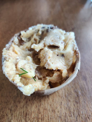 Toch even nagevraagd bij haar wat het smeerseltje was...Zonnebloem boter. Dus ik vroeg "hoezo zonnebloem?" Er zaten nl geen pitjes in, nee het was volgens haar zonnebloemolie vermengd met boter en wat kruiden. Klinkt dat lekker? Nee, en zo smaakte het ook, bah.