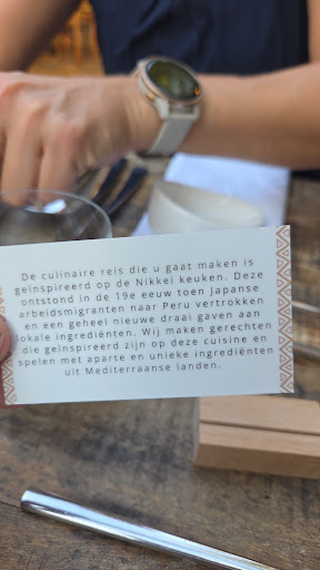 Wow wow wow, wat een geweldig restaurant! Voor mij was het een verrassing waar wij gingen eten omdat mijn echtgenoot dit had geregeld, ik wist niet dat op deze locatie een ander restaurant zat, ( voorheen La Cabaña) maar wat hebben wij heerlijk gegeten! Het is een combinatie van de Nikkei keuken ( Japanse en Peruaanse) en Mediterrane keuken. Wij gingen voor het 6 gangen verrassingsmenu en ik kan je vertellen een verrassing was het zeker, het ene heerlijke gerecht na het andere, geweldige smaakcombinaties, echt genieten!! Het restaurant zelf ziet er smaakvol uit, mooie lichte inrichting, bediening super vriendelijk, de chefkoks kwamen ook gerechten uitserveren ( dit vind ik altijd een pluspunt) Leuk detail: bij ieder gerecht kreeg je een kaartje erbij waarop het gerecht stond en uitleg over het gerecht. Als ik een minpuntje moet benoemen dan is het dat ik persoonlijk de tafeltjes waar wij zaten erg dicht op elkaar staan, aan een kant zit je op een bank, nu was het niet heel druk en zat er steeds 1 of 2 tafeltjes tussen, maar als het vol zit is dit ook niet echt prettig als je naar het toilet moet omdat je dan net langs het tafeltje past, lijkt mij dit voor degene die naast je zit ook niet echt fijn. Ik raad dit restaurant zeer zeker aan als je een keer totaal iets anders wilt eten, voor mij persoonlijk was het echt een culinaire beleving met zeer smaakvolle gerechtjes die ook nog eens prachtig werden opgediend! Dank voor de fijne avond en wij komen zeker...