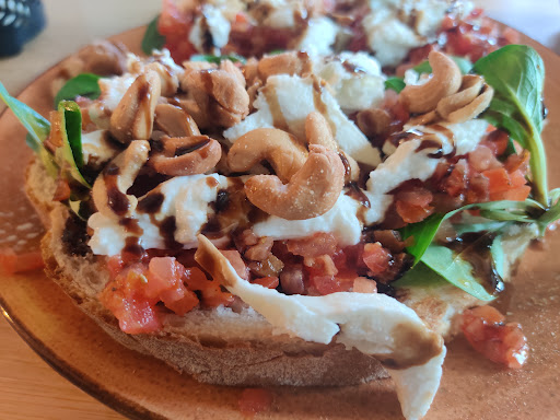Voor mij de eerste keer een het is wederom een sfeervolle plek in Tilburg.. Ik had de 3 Bruschetta met een soepje. Hier weet men niet het verschil tussen een bruschetta en een crostoni. Wat men hier serveert zijn crostoni, geen bruschetta. De broodjes zijn wel heel ruim belegd, complimenten hiervoor. Er zit wel een "downside" aan. Die beschrijf ik verderop. Mocht je van noten houden ben je hier aan het juiste adres, overal zit een hele lading noten op. Eigenlijk moet bij de ingang een bordje hangen "verboden voor mensen met een notenallergie. Serieus ik ken mensen die direct zijn epipen zou moeten gebruiken als hij hier 1 minuut binnen zou zijn. Elke tafel om hem heen gerechten vol noten, overal sporen van noten in de lucht......Is iets om over na te denken. Ok, terug naar mijn eten. De krabsalade op mijn crostoni is natuurlijk geen krab maar surimi. Tragisch dat de bediening dat niet wist. Surimi, industriële witvispasta chemisch ontdaan van alle smaak en structuur, vervolgens in dunne sheets geperst, opgerold, kleur- en smaakstoffen erin en dan noemt men het crabsticks om de associatie met echte krab op te wekken. Echte troep dus. En natuurlijk goedkope troep. Maar het ziet zo "leuk" uit......en het heeft een zoetje in de smaak...Kennis van zaken laat een heel ander licht schijnen op producten.