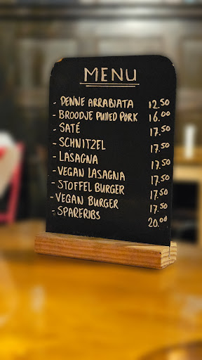 Cafe met eetgelegenheid en met buitenterras Ons gezelschap nam er 2x de 'stoffelburger' en 1x de 'schnitzel'. Er werd zekerheidshalve gevraagd om de hamburgers goed te doorbakken. Toen alles werd geserveerd, bleek al snel dat de hamburgers vrijwel rauw waren vanbinnen, en de begeleidende slaatjes die met de gerechtjes kwamen waren niet meer dan wat in een potje gepropte 'droge' sla zonder bijvoorbeeld een tomaatje. wortel of andere groente. We hebben dit alles zowel in het begin als bij het vragen naar de rekening opgemerkt aan het personeel, maar ondanks dat deze enerzijds aangaven dit erg voor ons te vinden is er ons anderzijds geen enkel aanbod tot compensatie gedaan (noch een voorstel om goed gebakken hamburgers te brengen, noch een voorstel tot enige korting). Uiteindelijk is het enige dat OK was hier, de schnitzel en de begeleidende frietjes. Wij gingen er met een slecht gevoel terug naar buiten ... Ik raad dit café aan om zich voortaan te beperken tot heel simpele snacks zoals bijvoorbeeld een croque-monsieur, bitterballen of een frikandel: zaken waar je m.a.w. niet veel verkeerd...