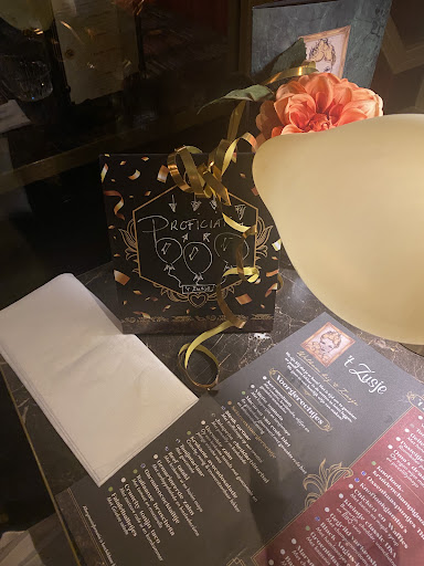 Voor ons was het de eerste keer ât Zusje. We werden hartelijk ontvangen door een vrolijke man die ons vervolgens naar onze tafel begeleide. Eenmaal aangekomen bij de tafel stond er een leuk dingetje klaar dat ons feliciteerde met ons jubileum.