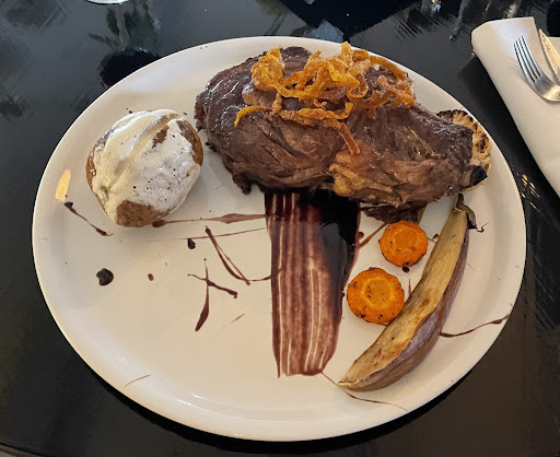 Ik had als voorgerecht een “vis plate” met zalm, forel en paling. Kostte €10,50, ik kreeg hier dan ook 2 plakjes gerookte zalm, niet dikker dan 2 millimeter en lengte van een pink, 2 stukjes forel ter grootte van een halve pink en 2 stukjes paling ter grootte van een halve pink voor. Ik snap dat vis duur is, maar dit was echt armoedig.