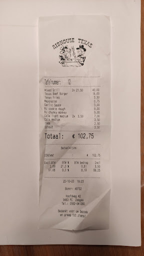 Read moreMet een gezelschap van 7 volwassenen en 2 kinderen hier gegeten na een dagje TT in Assen. Ontvangst was goed we werden aan tafel gebracht en daar werd de kaart op tafel gelegd tot dus ver goed, na wat nadenken hebben we onze drankjes besteld en daarna het eten, helaas was dit een stuk minder dan we gewend waren van Ribhouse Texas aangezien we wel al een paar keer in Epe waren geweest. de spare-ribs waren zo uitgedroogd dat het met mes en vork nog niet van elkaar te scheiden viel ook was het niet te kluiven waarop de serveerster ons vertelde dat op de kaart stond dat ze droog gegrild werden, nou voorgewarmd in de magnetron en daarna op de grill gelegd waardoor deze volledig uitgedroogd werden geserveerd, na dit gezegd te hebben is dit wel opgelost door een ladysteak te serveren die op verzoek wel rare gebakken was. De ribeye was besteld rare maar kwam medium well done aan tafel redelijk zwart, de lende biefstuk precies eender was medium rare besteld maar werd medium well done op tafel gezet, de mixed grill was redelijk te eten op de spare-ribs na die waren ook te droog, de frites die je apart erbij moest bestellen waren zo hard dat je de koe er op 100 meter mee kon doodschieten, wel op zich lekker gekruid alleen jammer dat men dit ook bij de kids doen kinderen van 1,5 en 3 jaar die moeten dit niet ook de kipnuggets waren niet te eten en de kleintjes hebben er nog last van gehad. Al met al een zeer nare ervaring die ons inziens voorkomen had kunnen worden met bekwaam personeel we zaten namelijk met 2 professionele koks aan tafel waarvan 1 zelf een grill restaurant heeft gehad en die weten waar ze het over hebben, de kok aldaar aanwezig stond waarschijnlijk alleen en kon niet alles bijhouden waardoor het op de grill waarschijnlijk fout ging. Al met al een domper op een zeer leuke dag en van ons uit helaas geen...