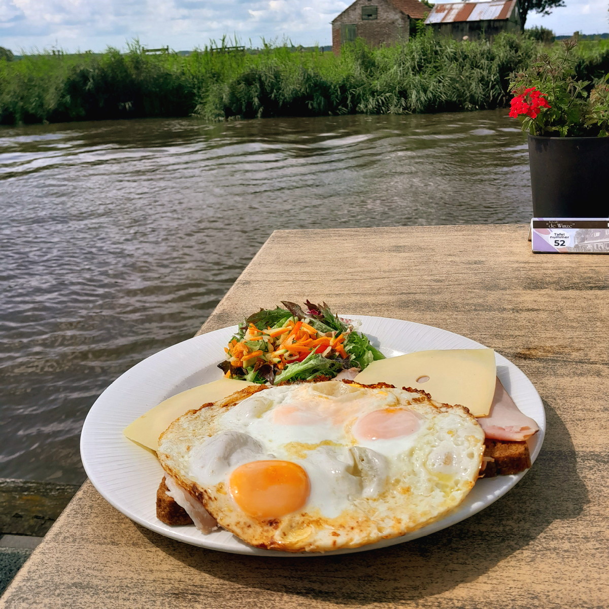 Read moreHier kan men rond de lunch een uitsmijter eten op een bijzondere plek. Mocht je dit wensen, dan kun je jouw eitje namelijk verorberen binnen een halve meter van de Dokummer Ee! De uitsmijter laat zich het best typeren als zijnde zonder pretenties. Geen bijzondere culinaire vervoering, maar gewoon een puike hap voor de lunch. De uitsmijter ligt op een aardig plakje brood. Niet al te dik, maar in evenwicht met de andere bestanddelen. Er is geen sprake van onnodige vulling. De kaas en de ham zijn beide goed van smaak. In het bijzonder zijn beide vrij mild waardoor het ei beter tot zijn recht komt. Een eventueel stukje brood waar niet direct een ei bovenop ligt, is ook gewoon goed te degusteren. Niet te zout en niet te flauw. De dooiers zijn niet altijd even consistent. De een lijkt wat loperiger dan de ander. Gemiddeld genomen zijn ze voor onze smaak iets te solide. Maar goed, wij zijn ook maar pedante criticasters. Verder is de salade omvangrijk en voorzien van een dressing die niet te schreeuwerig is. Deze vormt daardoor geen ongewenste afleiding van de uitsmijter en blijft gewoon een fijne hap tussen de bedrijven door. Voor hen die gewoon een hapje willen eten tijdens hun fietstocht: Dit is een prima plaats om de fiets even te parkeren en te genieten van een welverdiende uitsmijterpauze.