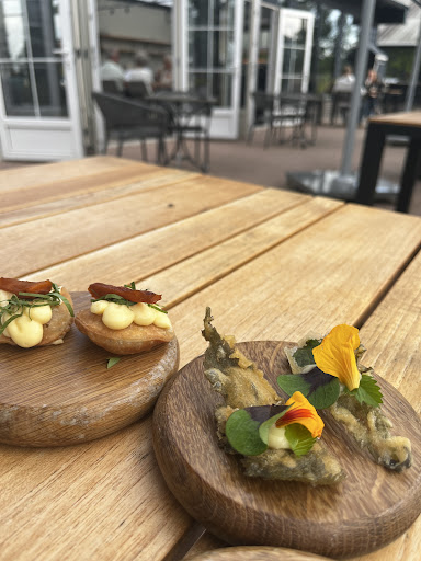 De amuse-gang begon buiten, tussen bloemen en groentebedden, waar we onder de zomerzon genoten van kunstzinnige miniatuurhapjes zoals een tarteletje met aubergine en geitenkaas, en een ‘pizza’ met Stokâlde Fryske. Elk element was smaakvol, speels en prachtig gepresenteerd.