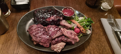 I had a mixed plate with Lamb, Chicken, entrecote, sweet ribs and a piece of beef. On the side I had a bit of salat, a tomato and a some bbq sauce. In a medium size metalholder I had some really great freshmade frenchfries.