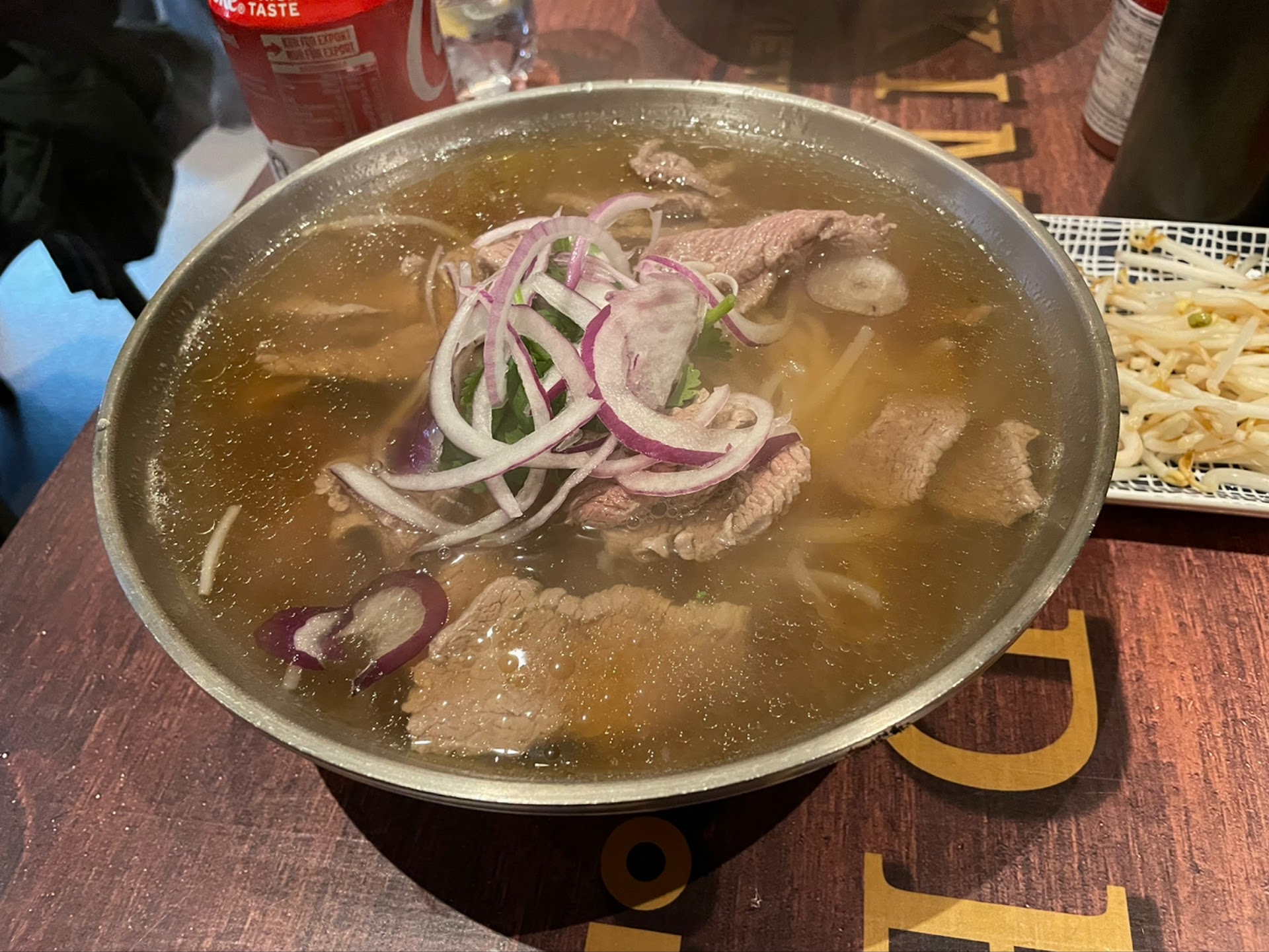 Food amazing but note that they have so much business they make zero effort with customers. No customer service here. You have to pipe up and ask them directly what you want and ask any questions you have. They will not give you information on anything not specifically asked. They only go outside the door to deliver food to tables or for take away. They won't come out and ask about tables or explain anything. They monitor only inside tables but outside is a free for all. If a table becomes free you just sit down then go inside for a menu, to order and pay. We came to sit in knowing it was a tiny venue with limited seating and could be waiting (all from reviews) but had no idea how the system worked. Luckily a couple arriving after us explained this. I had been inside already and nothing was explained. Left standing outside while there were free tables because the staff didn't communicate. It does say it on the two tables outside 'order inside' but I do think they need to make it clear though that outside tables are a free for all just sit down when its free. We would of been sat down outside much earlier if this was explained but it wasn't. No smiles, no chat, actually just ignored for awhile while standing being stared at by staff. Very odd customer service experience indeed. But the food is great!!! If you hate coriander they will serve it without just make sure to ask. 9.50 for a bowl of pho, good prices if sat inside. They...