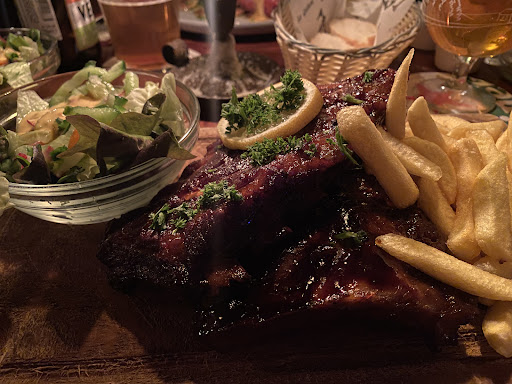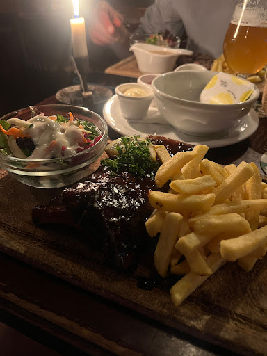The atmosphere is lovely. Dim lights, lovely fireplace. The woman serving us was very nice and immediately informed us the mussels and steak were sold out which was a disappointment after looking at the menu. I was unfortunately not impressed by the menu. The waitress brought bread for the table but the bread came with what I would describe as ranch dressing. It was odd if not entertaining for a table full of Americans. I ended up ordering a beer, the greek salad, and the hamburger. My friends ordered the schnitzel and the veggie burger. My beer was fantastic, the greek salad however had a strange sweet dressing that tasted like it came out of a jar. The burger was slightly overdone and kind of flavorless. the fries were fine and the salad that came with it had a heavy mayonnaise based sauce that was not to my liking either. All in all not a terrible experience but definitely not great. Im surprised by the 4+ star reviews...