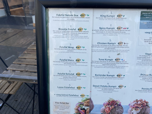 This is absolutely an undiscovered gem in Utrecht! Located in the middle of the city centre, I was surprised that I have never seen it before. It's a small restaurant but with lots of space (also outside for if you want to people-watch). There are so many options, from filled potatoes and fries to falafel/chicken bowl, wraps and pitas. They have vegan and vegetarian options, and also offer sweet potato dishes (the fries are amazing). There is no stress during ordering because there is very convenient self-order service. The staff was also super friendly and let us fill our own wraps with extra's. The prices are very reasonable as well (fries are around 5 euros, patatos around 11 and the falafel wraps around 9). In short, I am definitely coming back and will recommend this place...