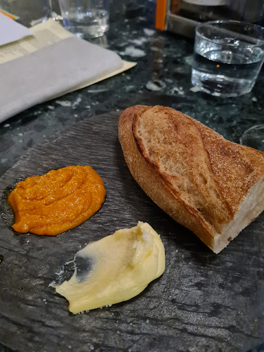 We begonnen met een half broodje met pompoencreme en boter. De creme was heel lekker, zeker in combi met de boter. Als voorgerecht hadden we de andijvie a la plancha en de french dip. De andijvie zag er goed uit, maar elke hap bevatte zand. De french dip is gewoon een hotdog broodje met dun gesneden entrecote (zoals een broodje rosbief) en kwam met een jus en 3 plakjes augurk. Deze was ok, niet boeiend en als ik had geweten dat het een broodje koud vlees was, had ik er niet voor gekozen. Daarna kwam de king boleet met truffel en de kalfsragout met zwezerik. De kingboleet heb ik niet van gegeten, maar zag er ok uit. De ragout was prima, de zwezerik ook, maar had niks bijzonders. Voor dessert kozen we de citroen merenguetaart en de 'colonel'. De taart was lekker, maar veel te zoet. De colonel is een sinaasappelsorbet met gin en triple sec en het is precies dat. Er werd een glas met een bol citroensorbet geserveerd. Daaroverheen ging een scheut gin en een scheut triple sec. Ik had er misschien iets anders van verwacht.