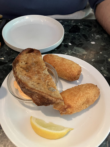 Rosie is een kleine zaak. Er zijn maar een paar zittafels. We hadden een plek aan de bar, naast de keuken, waar je zo'n beetje tegen elkaar aan zit. De eigenaaren staan achter de bar en in de keuken. En beiden leken er niet zo'n zin in te hebben. Het voelde in ieder geval niet warm en gastvrij. De bediening loopt ook niet rond alsof ze daar willen zijn. Er lijkt bijna geen lach vanaf te kunnen.