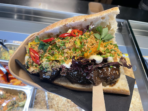 I had a âbroodje rendangâ which was one of the best looking and tasting sandwiches I have ever had. However, I will never ever order it again. The reason is that this âbroodjeâ is just impossible to eat. There is no way that you can get the sandwich into your mouth, full stop. It is just too wide to fit in, and if you would try most of the ingredients would fall all over the place. All you can do is eat it from the bread using a fork, hoping not to drop anything. Eventually you are left with mostly bread which you can get into your mouth, but at the cost of getting sauce all over your fingers. Very unfortunate that what could be one of the best sandwiches in Utrecht is served in this...