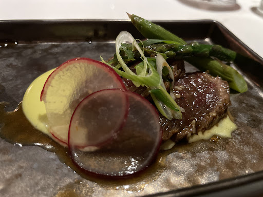 Het eten zelf was heerlijk! Alle 5 de gangen smaakten ons prima, met name de 1e 3 gerechten. Het dessert was wat eenvoudig, maar toch wel lekker De service was lachwekkend slecht. Nog nooit eerder hebben we zoveel missers op 1 avond meegemaakt. Een korte impressie: de tafel was qua bestek gedekt voor 2 gangen. Hierdoor werden alle 3 de volgende gerechten (dus zowel gang 3, 4 en 5) geserveerd zonder dat er bestek op tafel lag. Dus ook na 1x vergeten werd hier de volgende keren niet van geleerd. Bij het dessert duurde het zelfs meer dan 10 minuten en was het ijs ondertussen al bijna gesmolten bij het uitserveren van het dessert werd keurig gevraagd of we er iets bij wilden drinken. De 2 thee die toen besteld werden, zijn echter nooit gekomen toen we bij het afruimen van het dessert informeerden of de thee nog kwam, kwam er enkele minuten later iemand vragen of we alle 4 thee wilden. Toen we de bestelling gewijzigd hadden naar 3 thee en een espresso kregen we na wat wachten 3 thee en een koffie. Gelukkig kwam de espresso na correctie alsnog binnen 5 minuten informeren naar wijn bij de diverse gangen was ingewikkeld. 3 van de 5 gerechten is dit gelukt, echter wel ‘grappig’ dat voor de rode wijn de fles kwam, maar daarna weggelopen werd omdat er bij mij geen fris rood wijn glas klaar stond, terwijl er nog wel 3 op tafel stonden bij de andere gasten die geen wijn drinken toen 1 van de gasten om zo’n heerlijke alcoholvrije mojito vroeg, werd die bestelling keurig opgenomen, echter zonder dat de overige gasten die overduidelijke lege glazen voor hun neus hadden iets gevraagd werd en was de serveerster binnen seconden van tafel weg gerend ook bleven alle lege glazen en borden veelal op tafel staan en werd niet leeg geruimd de helft van de drankjes stonden niet op de rekening. Toen ik daar melding van maakte werd er op mijn aanraden nog wat toegevoegd op de rekening.