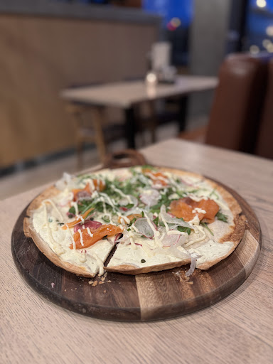 I went here to lunch with a colleague. It's spacious with comfortable distances between tables. The staff was friendly and you could completely follow the cooking process in the open kitchen setting. They have a nice variety of items on their menu, ranging from club sandwiches, salads, burgers to pizza and flammkuchen. We ordered a club sandwich and a smoked salmon sandwich. The latter comes with brioche bread instead of regular bread which makes a surprisingly tasty combination of flavors. The club sandwich was nice and filled richly. The coffee was good (they have non-dairy options) as well. Definitely a good place to enjoy a...