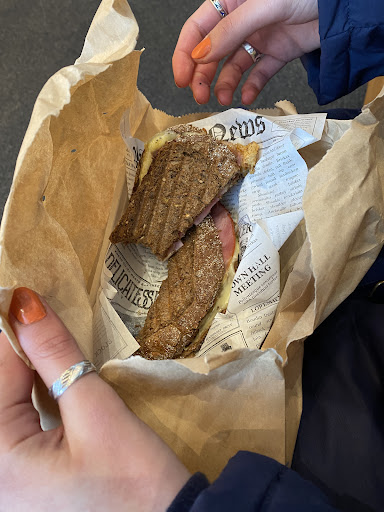 Nach geduldiger, überschaubarer Wartezeit bekam ich das bestellte, vegetarische Panini auf dem Holzbrett serviert.